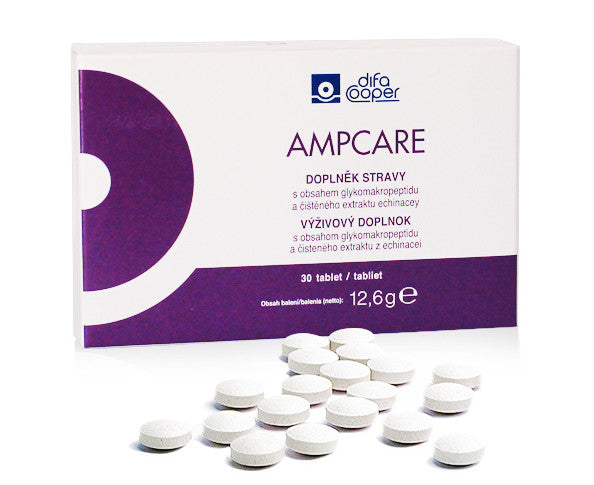 AMPcare is a patented natural food supplement containing Glycomacropeptide and pure Echinacea extract. The glycomacropeptide contains an extract from the cell walls of the fungus Candida utilis, combined with plant proteins and supported by an inorganic form of phosphate and calcium sulphate, which provide the stability needed for oral use and do not destroy in the acidic environment of the stomach. Echinacea contributes to the normal function of the immune system.