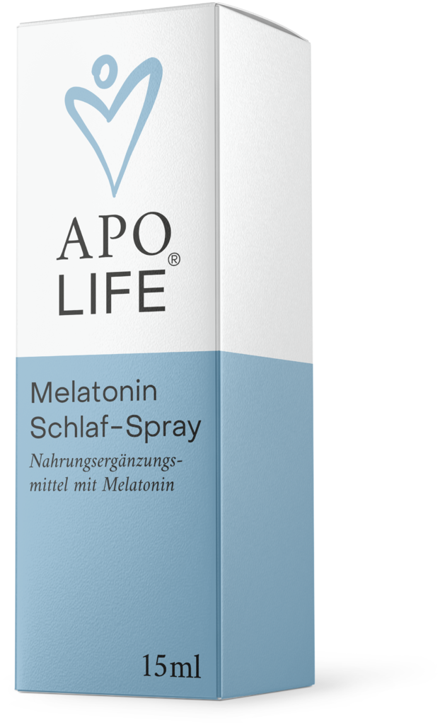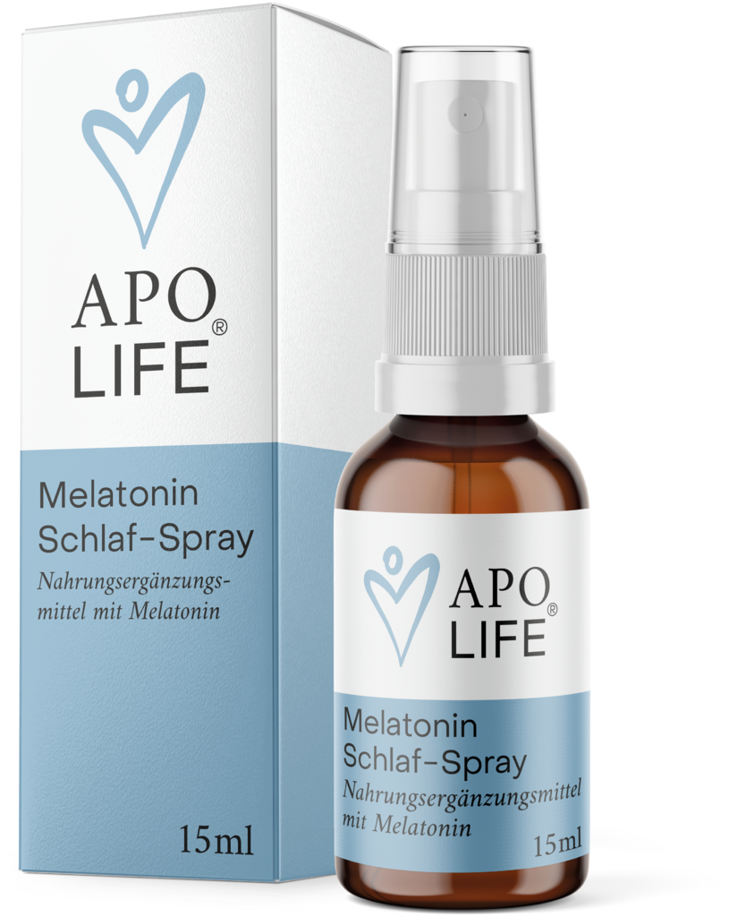 ApoLife "Melatonin Sleep Spray" contains melatonin, a natural endogenous hormone that is produced from serotonin in the pineal gland (epiphysis) - a part of the midbrain - and controls the day-night rhythm of the human body in a 9% alcoholic solution . The dosage form as a spray ensures practical and simple application as well as rapid absorption of the melatonin through the oral mucosa and thus rapid onset of action.