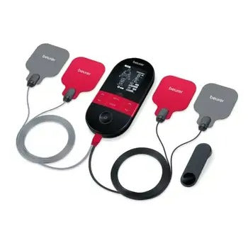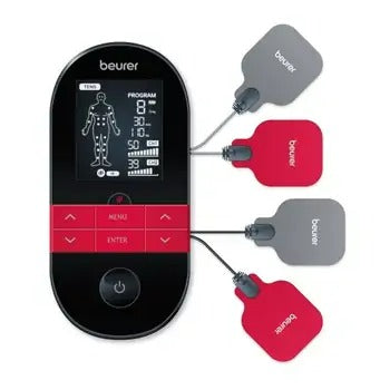 The modern Beurer EM 59 electrostimulator provides relief and stimulation for sore muscles . It offers 3 possible uses - TENS / EMS (muscle stimulation and pain treatment) and heat, only TENS (pain treatment) or heat only. At the same time, it allows the selection of 2 heat levels . Thanks to its ergonomic shape, it adapts well to the body, 4 electrodes with gel pads adhere perfectly to your skin. The electrostimulator also offers 64 pre-programmed applications and 6 individually customizable programs: frequency, pulse width, programmable on / off time, adjustable intensity, time countdown. The device is equipped with an electrode position indicator and a safety shut-off. The package includes a Li-ion rechargeable battery.