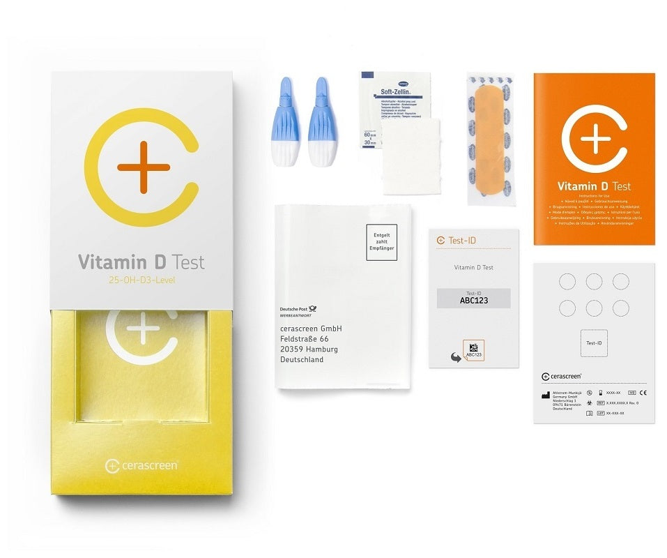 The cerascreen® Vitamin D Test is a home sample collection and submission kit. The test is used to determine the concentration of vitamin D in suspected vitamin D deficiency. The vitamin D test includes the evaluation of your sample in the diagnostics laboratory and a detailed report of the results.