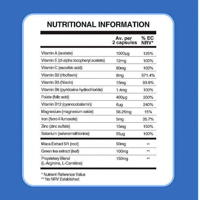 Vitamin A 1000 mcg, Vitamin E 12mg, Vitamin C 80 mg, Vitamin B2 8 mg, Vitamin B3 15 mg, Vitamin B6 1.4 mg, Folate (folic acid) 400 mcg, Vitamin B12 6 mcg, Magnesium 56.25 mg, Iron 5 mg, Zinc 15 mg, Selenium 55 mcg, Maca extract 50 mg, Green tea extract 100 mg, Blend (L-Arginine and L-Carnitine) 150 mg.