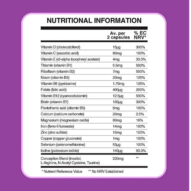 Vitamin A 800 mcg, Vitamin D 15 mcg, Vitamin C 80 mg, Vitamin E 4 mg, Vitamin B1 5.5 mg, Vitamin B2 7 mg, Vitamin B3 20 mcg, Vitamin B6 1.75 mcg, Folate (Folic Acid) 400 mcg, Vitamin B12 12.5 mg, Vitamin B7 150 mcg, Vitamin B5 6 mg, Calcium 20 mg, Magnesium 60 mg, Iron 14 mg, Zinc 15 mg, Copper 1 mg, Selenium 55 mcg, Iodine 140 mcg, Mixture (Inositol, L-Arginine, Cysteine, Taurine) 220 mg.