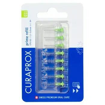 Brushes for perfect cleaning of the interdental spaces . With just one swipe in and out , you remove plaque from the side surfaces of the teeth, which the fibers of a regular toothbrush are not enough for. The prime range is suitable for 95% of users. The Curaprox CPS 011 prime refill package contains 8 interdental brushes with a diameter of 1.1 - 5 mm , which are compatible with all Curaprox holders.