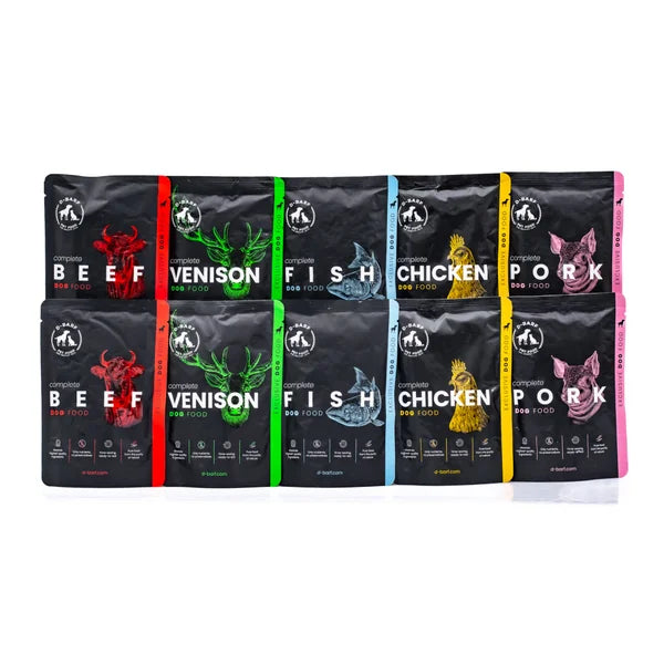 D-Barf Mix complete is a complete food for adult dogs of all breeds . The package consists of 10 pouches with juicy pieces of beef, chicken, pork, salmon and venison with selected vegetables, fruits and herbs for a balanced taste.