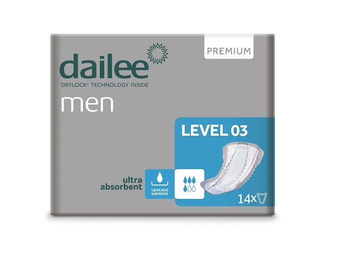 Disposable men's insoles for light incontinence DAILEE Men Premium are designed to collect urine. They are mainly designed to solve incontinence problems. They have an anatomical shape for perfect fit, maximum comfort and a long-term feeling of dryness.