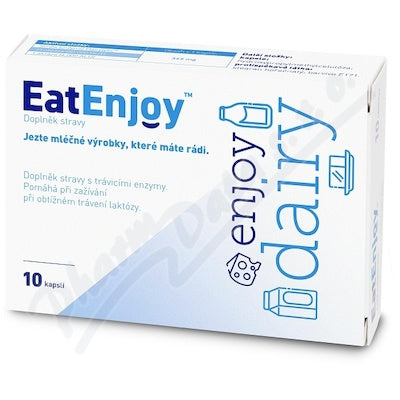 EatEnjoy Dairy is a dietary supplement containing the digestive enzyme lactase, which helps digest lactose, and a protease, which acts specifically on milk proteins.