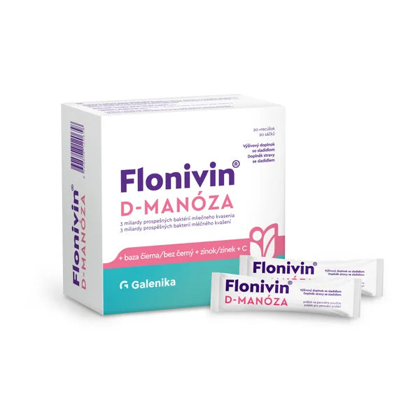 Flonivin D-MANNOSE + elderberry + zinc + vit.C is a dietary supplement that combines 3 billion beneficial lactic acid bacteria, D-mannose, elderberry fruit, vitamin C and zinc. The complex of 3 probiotic strains - Lactobacillus rhamnosus, Lactobacillus paracasei and Lactobacillus acidophilus, helps maintain the balance of your intestinal microbiota.