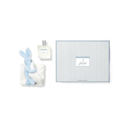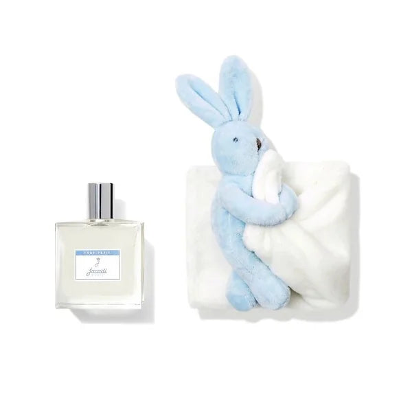The Tout Petit gift set from Jacadi Paris is the ideal gift for a newborn , combining a delicate fragrance and a cute toy. The set contains a 100ml bottle of fragrance , which is specially designed for the sensitive skin of babies . The fragrance begins with a fresh touch of lemon, bergamot and neroli, which gradually transforms into a sweet heart of orange blossom and Granny Smith apple, finished with a delicate base of musk and cedar wood. It also comes with a plush toy in the form of a blue bunny , which will become a nice companion for daily cuddles and will help develop your baby's motor skills.