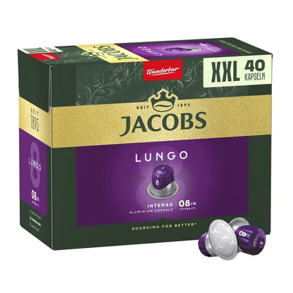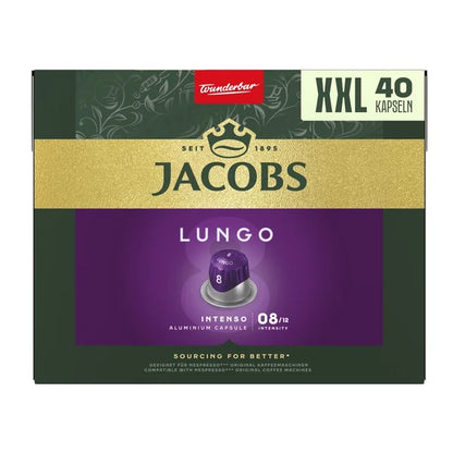 Jacobs Lungo Intenso coffee capsules are designed to better preserve the aroma and provide the ideal pressure for a perfect espresso or lungo extraction. The result is an intense taste experience and delicious coffee with a thick, fine crema. Now also available in a large, more convenient package, allowing you to enjoy your favorite coffee even longer.
