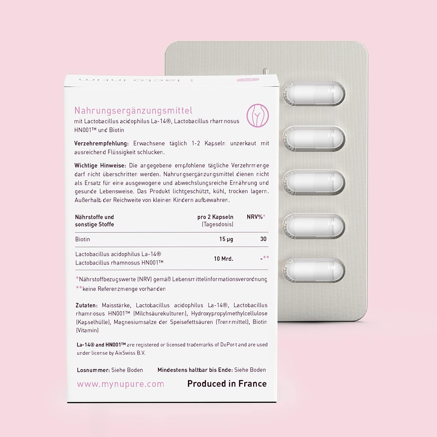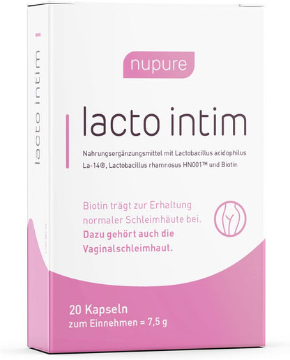- With milk acid bacteria: nupure lacto intim contains the scientifically researched bacterial strains Lactobacillus acidophilus La-14 and Lactobacillus rhamnosus HN001. These are among the natural colonizers of the vaginal mucosa. The strains used have been studied in clinical studies and tested for their special properties.