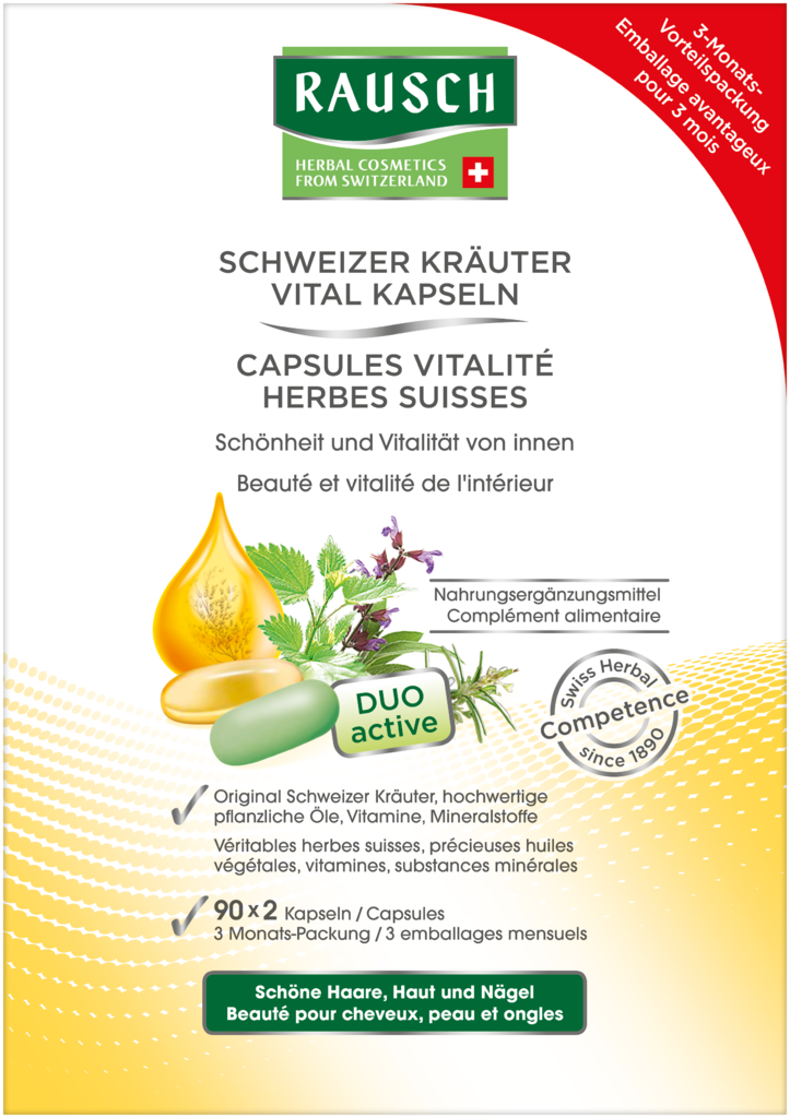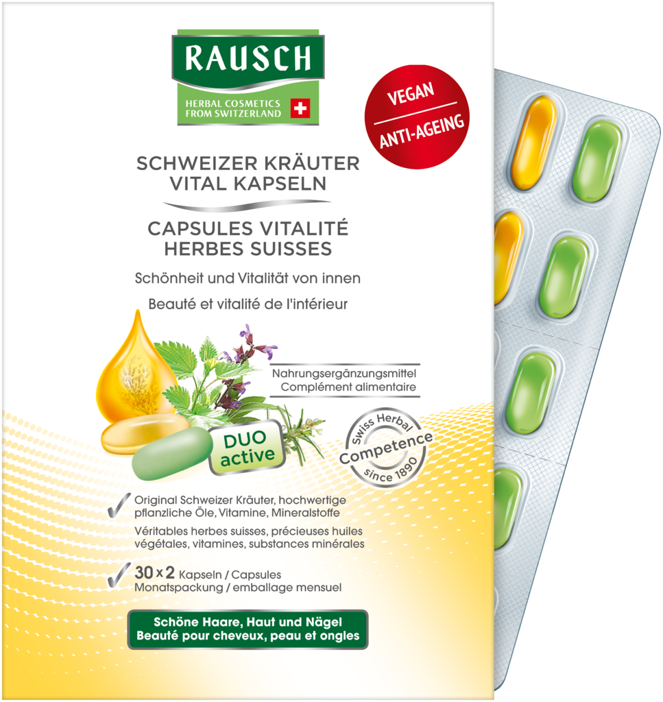 RAUSCH SCHWEIZER KRÄUTER VITAL CAPSULES with a unique combination of active ingredients consisting of 3 high-quality plant oils, 8 revitalizing herbal extracts and 12 vitamins and minerals for strong, full hair, supple, firm skin, healthy, strong nails and well-being.