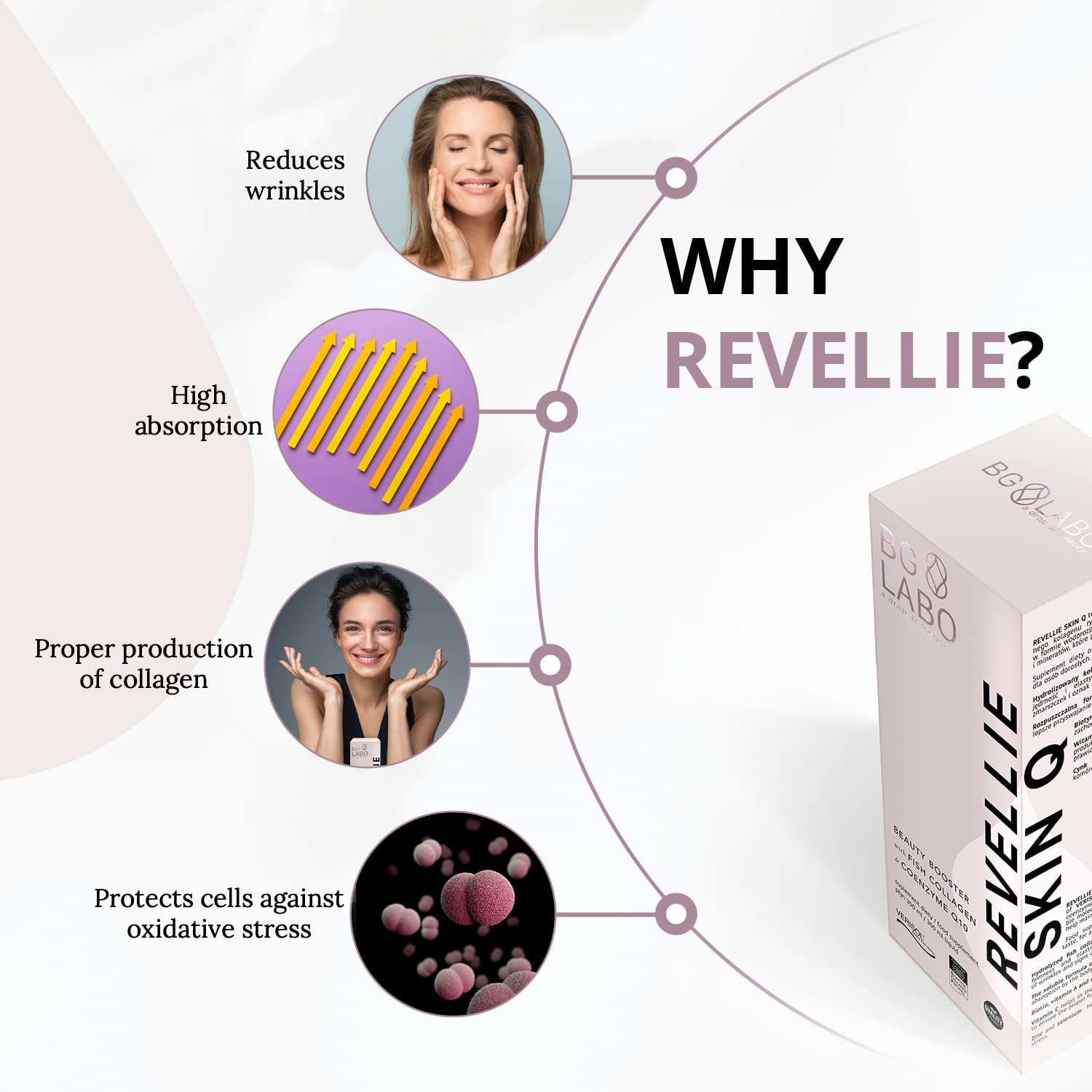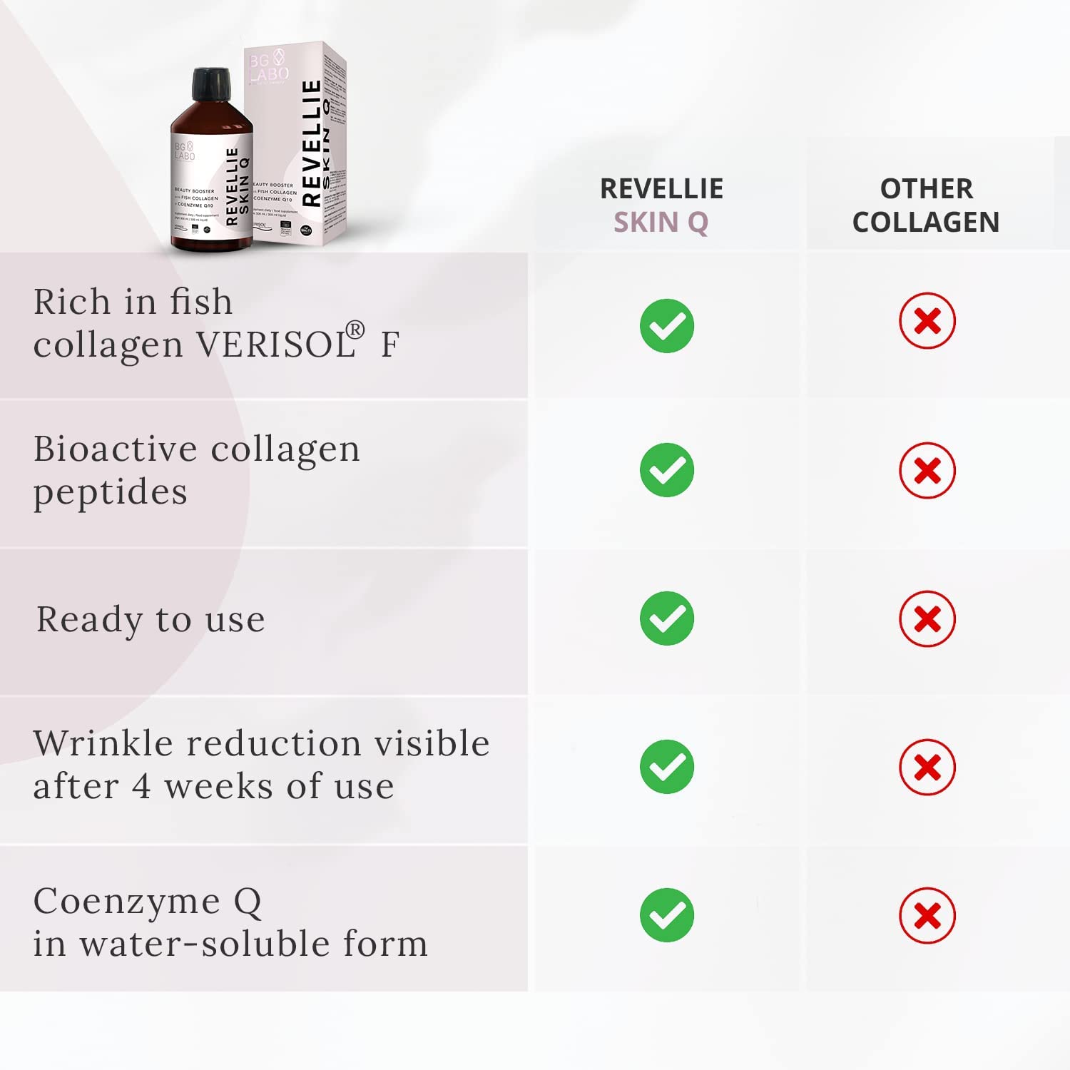 - REVELLIE SKIN Q - This is a liquid dietary supplement with hydrolysed sea collagen VerISOL F, enriched with coenzyme Q10. Rich in a nutrient complex of vitamin A and C, biotin, zinc and selenium, it supports your skin from the inside out. It protects the cells from oxidative stress, which helps reduce wrinkles and signs of ageing. Everything for beautiful, healthy and firm skin